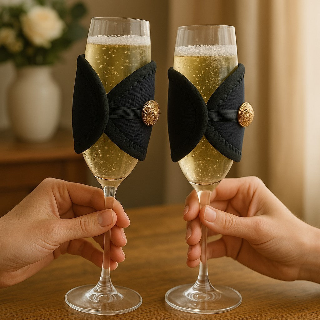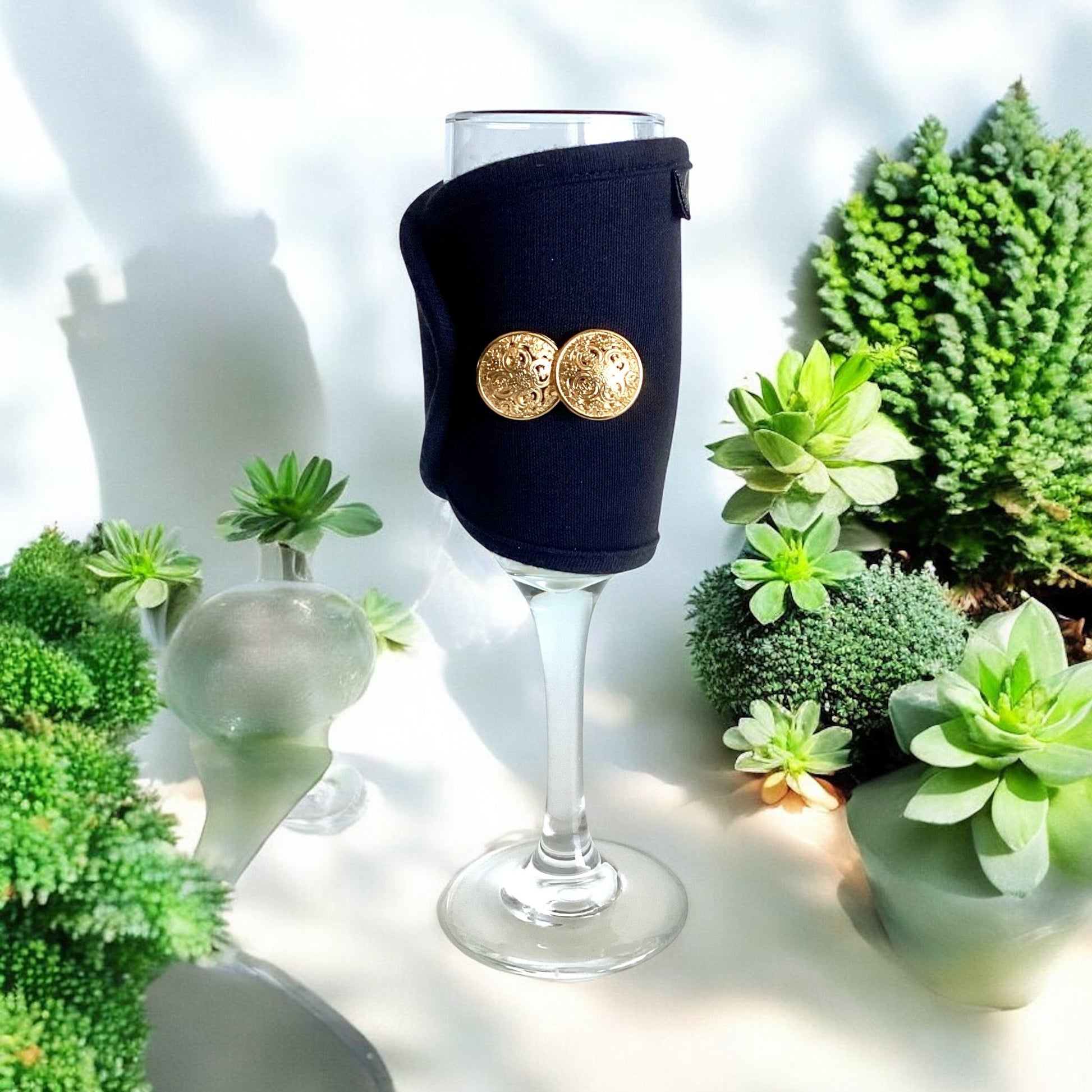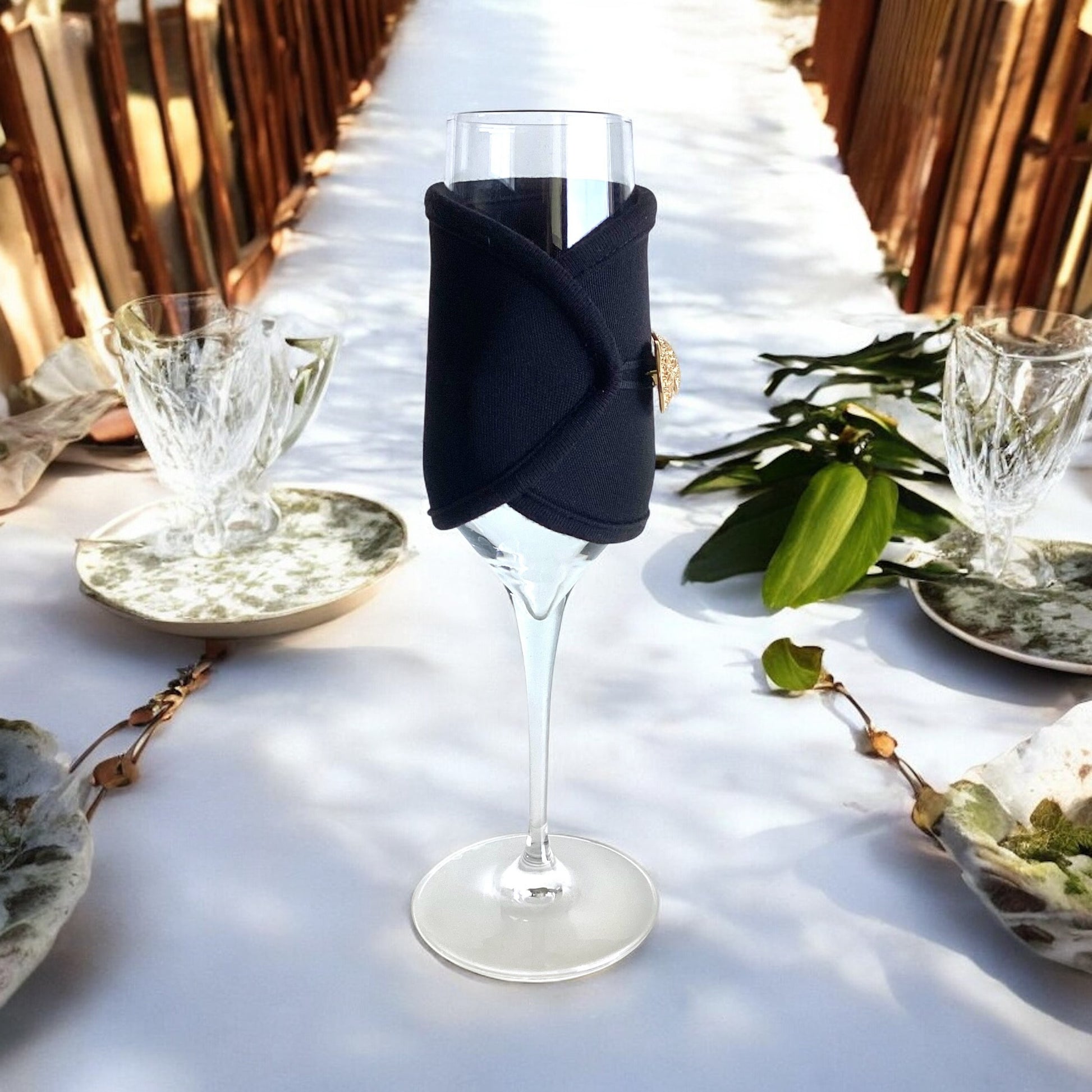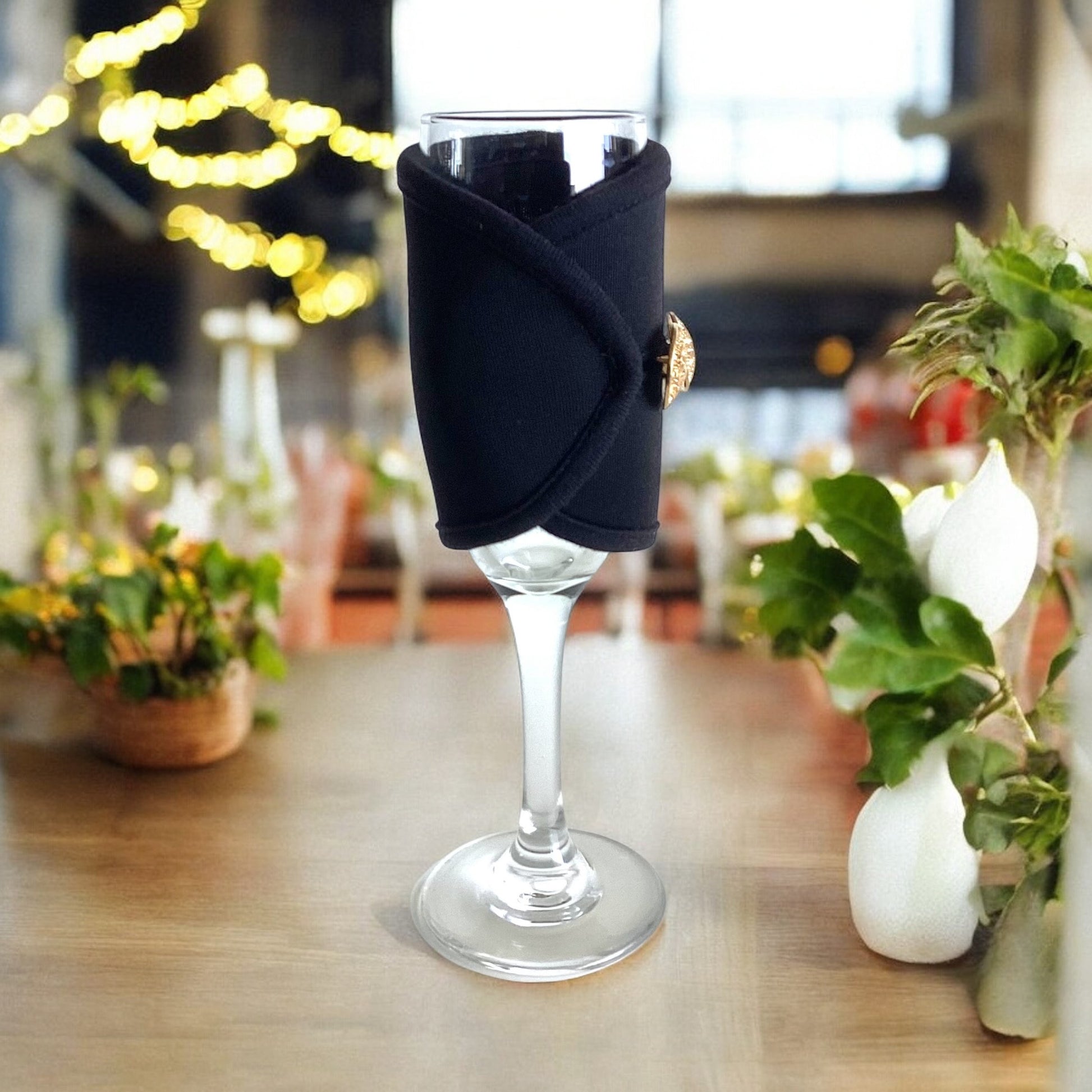 Keeping your "bubbles" chilled and cold is no longer a struggle while they also keep your hands dry by absorbing any condensation that may form,. These adjustable and insulated wraps fit various sizes of champagne flutes, both with and without stems. The two buttons and elastic loop allow adjusting to the appropriate size flute. (Glassware NOT included). Constructed with high quality Neoprene fabric, which is highly durable, flexible and used due to its insulating capabilities. Color: Black with Gold Buttons