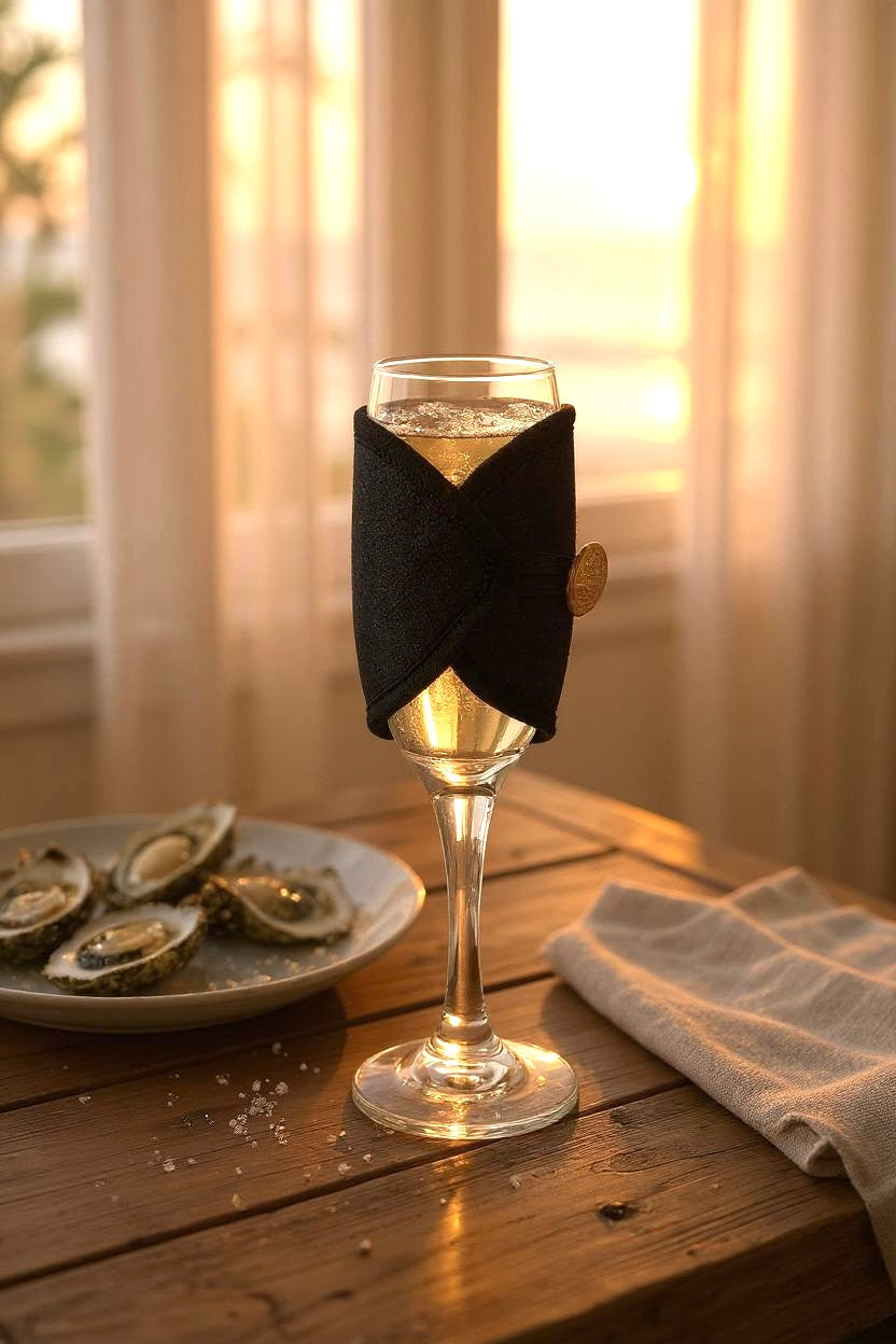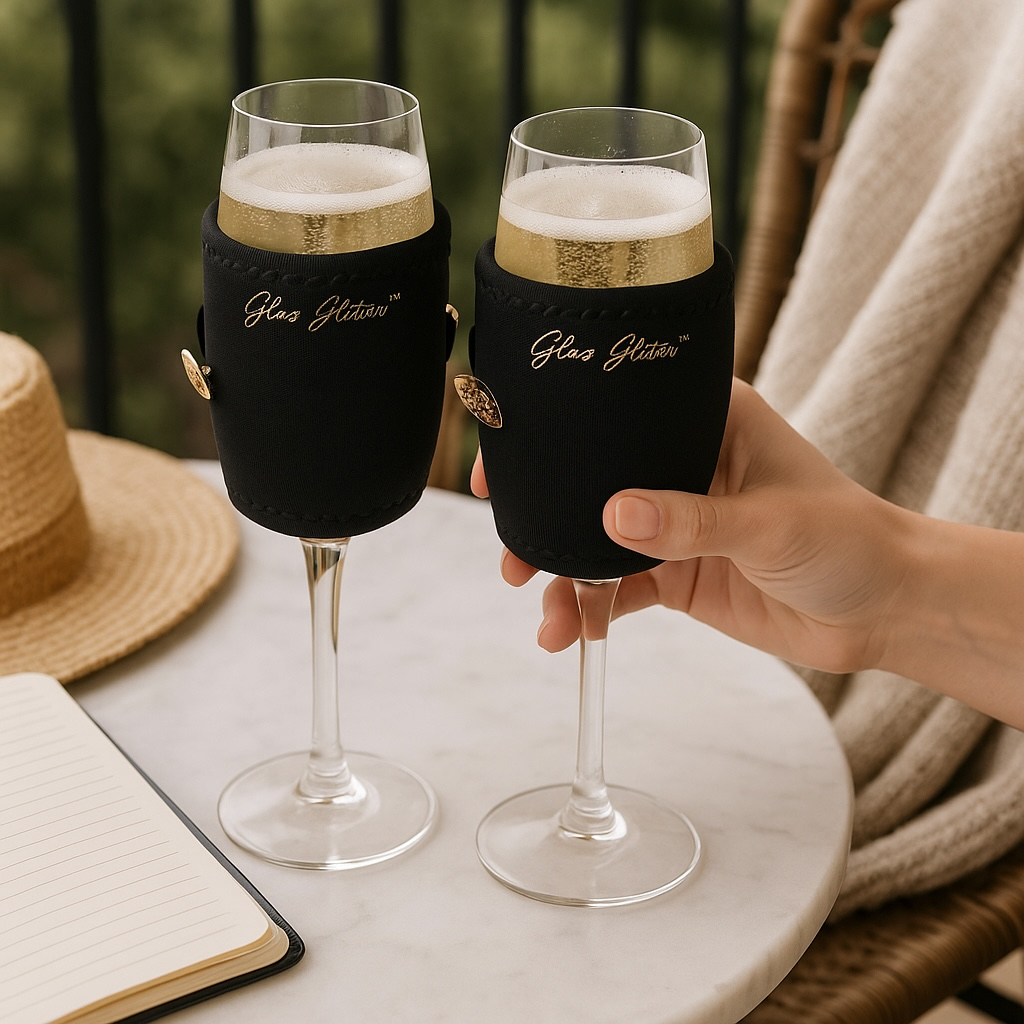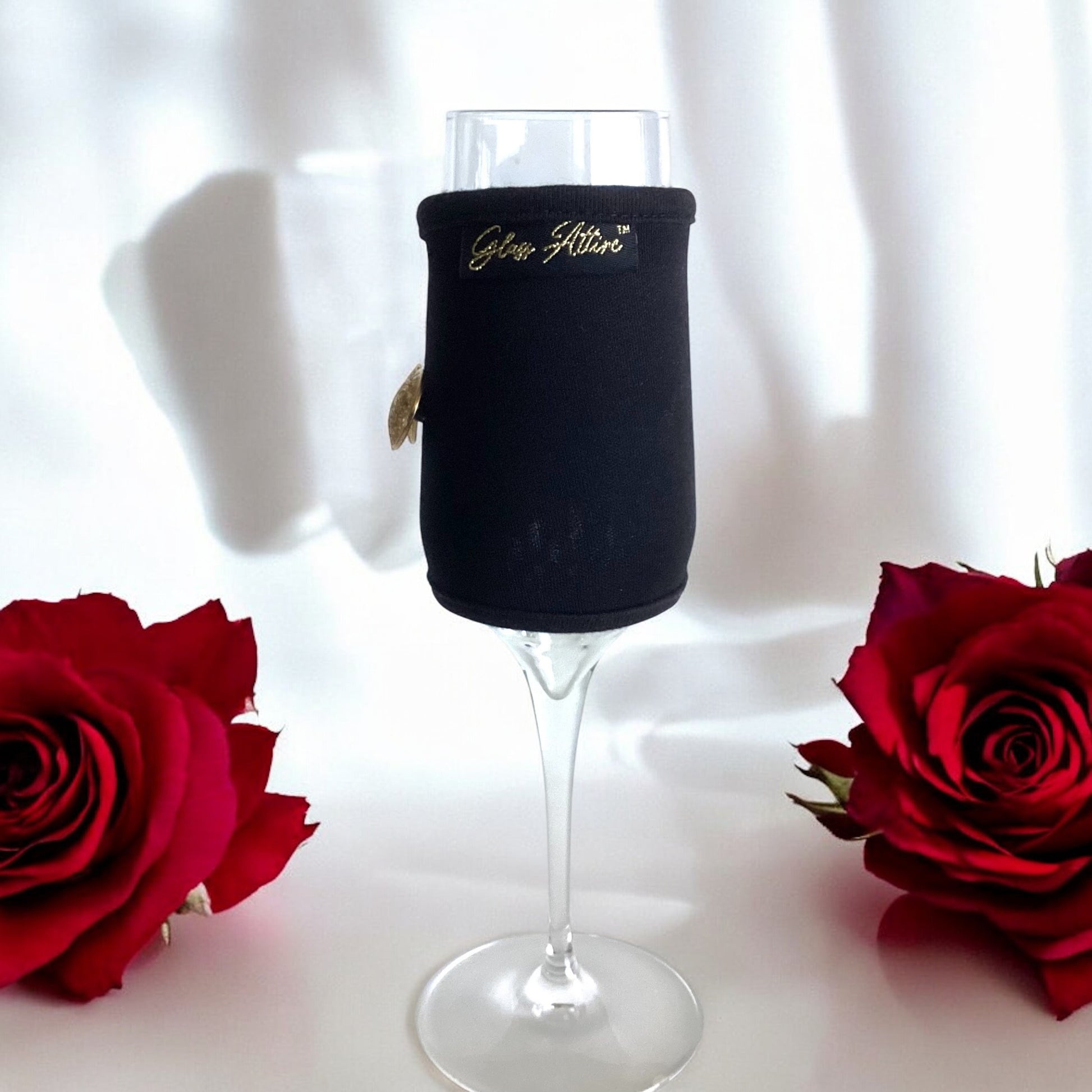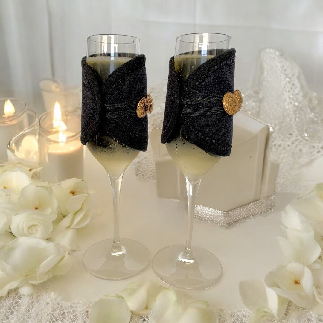 Keeping your "bubbles" chilled and cold is no longer a struggle while they also keep your hands dry by absorbing any condensation that may form,. These adjustable and insulated wraps fit various sizes of champagne flutes, both with and without stems. The two buttons and elastic loop allow adjusting to the appropriate size flute. (Glassware NOT included). Constructed with high quality Neoprene fabric, which is highly durable, flexible and used due to its insulating capabilities. Color: Black with Gold Buttons