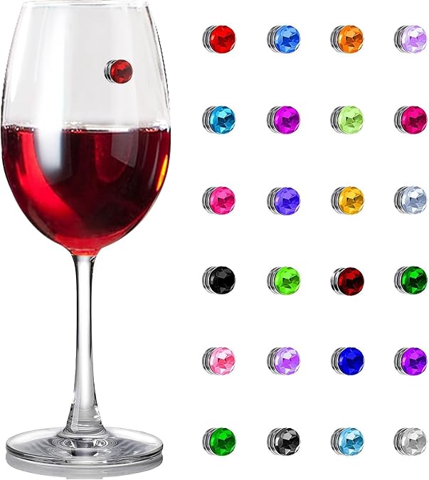 Gemstone colored magnetic glass charms. Magnetically attach to glass or other glassware to help identify your guests' glasses when entertaining.