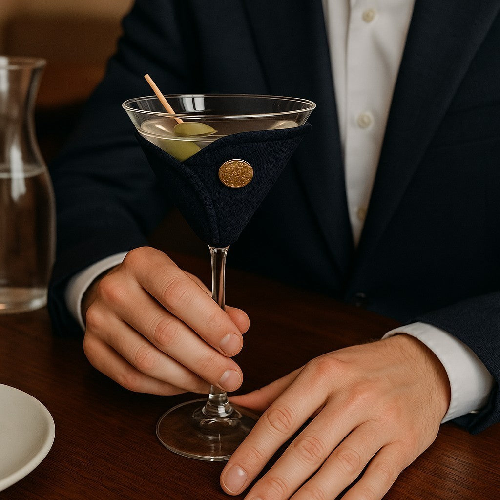 Fits most standard cocktail or martini glasses. Set of two. (Glassware NOT included). Constructed with high quality Neoprene fabric, which is highly durable, flexible and used due to its insulating capabilities. Color: Black with Gold Buttons. Patent Pending.