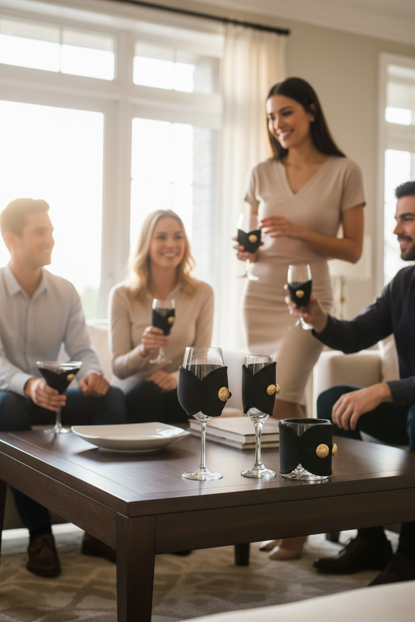 "Wine down Wednesdays" are no match for these insulated glass wraps to keep your wine crisp and chilled, and your hands dry as they absorb any condensation that may form. Because they are adjustable, they fit various sizes of wine glasses, keeping your white or red wines chilled while you enjoy them dining al fresco, by the pool, on the boat, or at your favorite outdoor space. (Glassware NOT included). Constructed with high-quality Neoprene fabric, which is highly durable, flexible, washable, and used due to its insulating capabilities. Color: Black with Gold Buttons